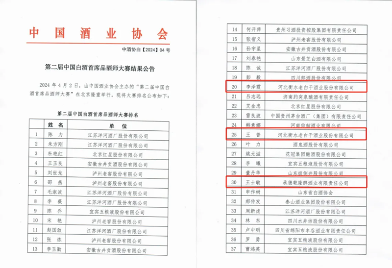 2024年4月2日,由中國酒業(yè)協(xié)會(huì)主辦的“第二屆中國白酒首席品酒師大賽”在北京隆重舉行。衡水老白干在原有李澤霞一位中國白酒首席品酒師的基礎(chǔ)上,又添王普、王士敏兩位中國白酒首席品酒師。