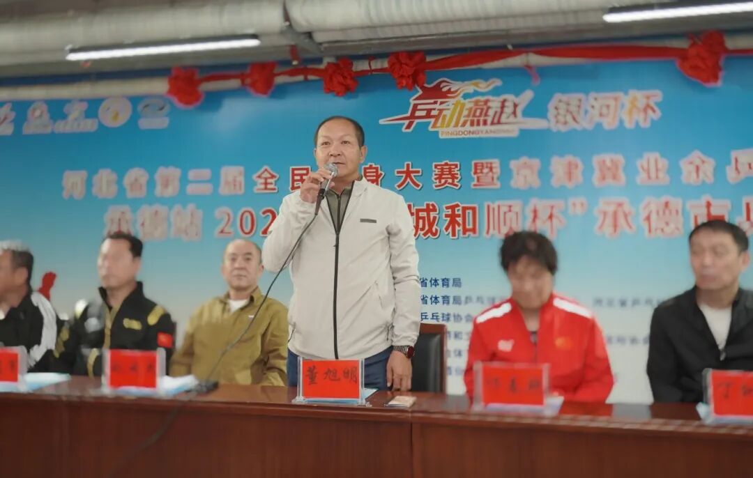 承德市政協(xié)副主席、工商聯(lián)主席、承德縣乒協(xié)總顧問(wèn)董旭明登臺(tái)宣布比賽正式開(kāi)幕。