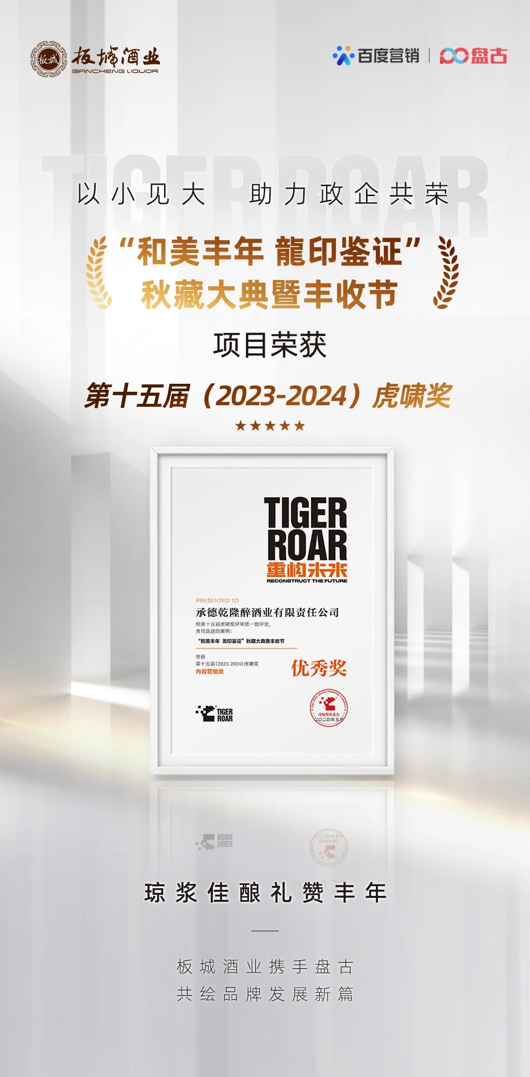 近日,第十五屆虎嘯獎頒獎典禮在上海舉辦,承德乾隆醉酒業(yè)有限責任公司憑借「“和美豐年龍印鑒證”秋藏大典暨豐收節(jié)」案例,以優(yōu)異的內容營銷創(chuàng)意、資源整合能力及出色的營銷效果,從1020家優(yōu)秀企業(yè)提交的4505件參賽作品中脫穎而出,榮獲第十五屆(2023-2024)虎嘯獎內容營銷類優(yōu)秀獎。